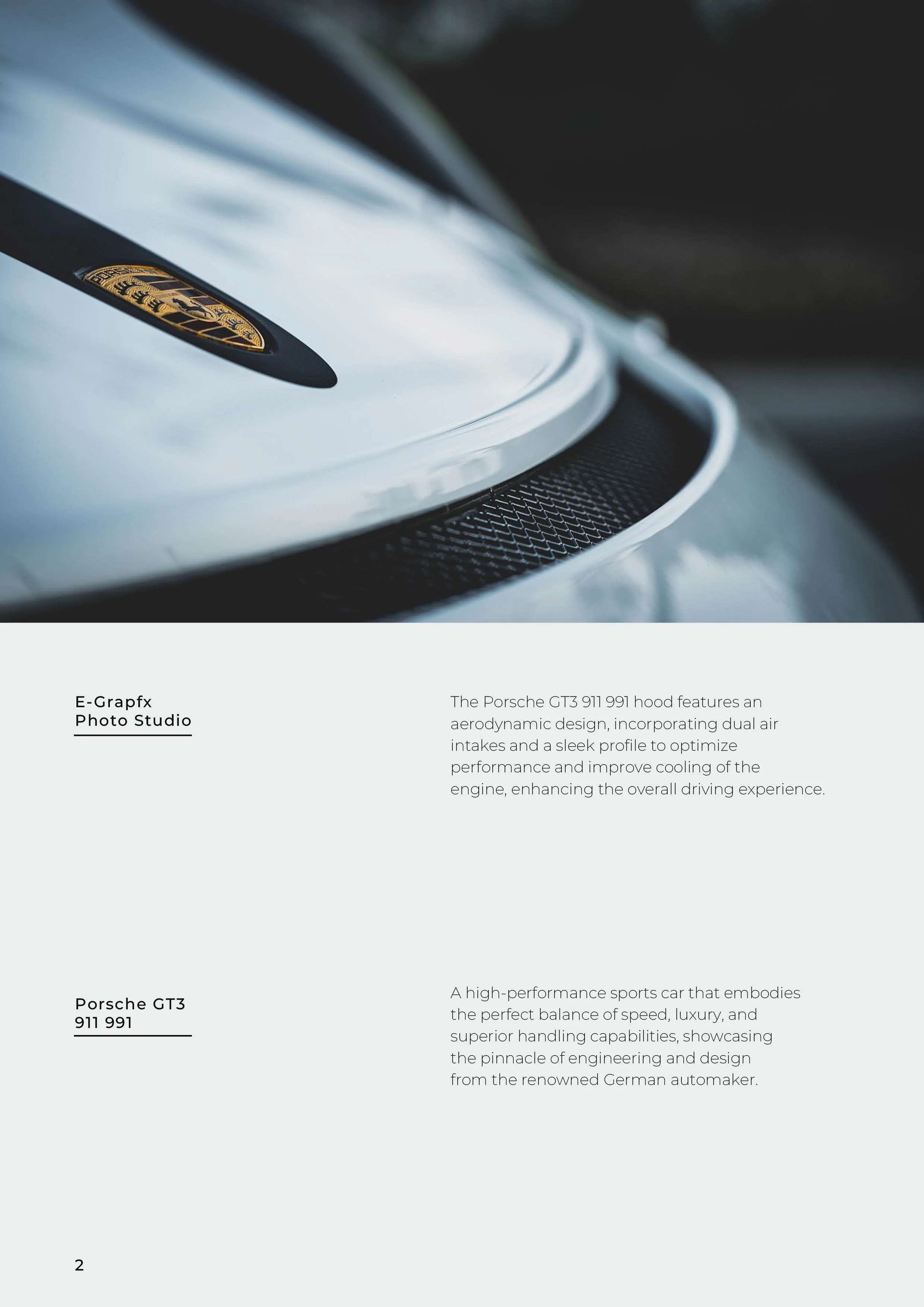 The editorial highlights the GT3 with sleek, balanced layouts that match the car’s sharp, track-ready character. Clean typography and wide spacing frame the bold, high contrast imagery capturing the GT3’s aggressive stance, fluid lines, and racing pedigree. The visuals let the car’s precision and performance speak effortlessly
